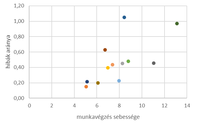 Ebben a példában is a színes pontok ugyanazt a tevékenységet végző, de fizikailag egymástól elkülönült egységeket reprezentálják. Az első következtetés, ami levonható, hogy a munkavégzés sebessége gyakorlatilag arányos az elkövetett hibák számával. A másik érdekesség a két véglet közti különbség: a jobbra fent található pont által reprezentált, illetve a balra lent található ponttal reprezentált egységek esetén az előbbi 2,5-szer gyorsabban dolgozik, de ötször annyi hibával. Jó-e ez nekünk? Ennek kontrollálása a vezetők felelőssége! Ennél a példánál maradva a magam részéről a világos kék pont által megjelenített egységet tekinteném „best practice”-nek, az egységek átlagának megfelelő sebességgel dolgoznak, de nagyon kevés hibával. A többieket is igyekezni kell erre a szintre hozni. Ez itt azt jelentené, hogy a tervek ugyanúgy teljesülnének (hiszen a munkavégzés sebességének átlaga nem változna), de a hibák száma legalább a felére csökkenne. Gondoljunk csak bele, hogy mit is jelentene a vállalkozásunkban, ha a költségeink közül az egyik tétel megfeleződne?! És ehhez csak adatelemzés és abból adódóan némi munkaszervezés szükséges.